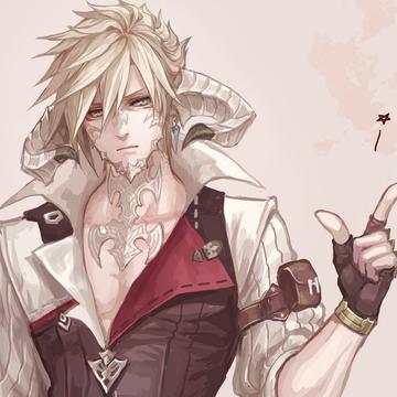 Draconic Features: Cream-coloured horns, tail, patches of scales all over his face and body